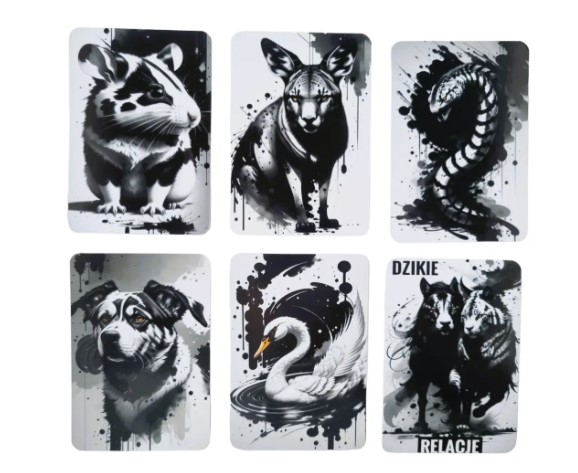 „Dzikie relacje” to zestaw metaforycznych kart złożony z 70 unikalnych ilustracji zwierząt, ptaków i owadów w jednej stylistyce. Zostały one stworzone z myślą o pracy z tematyką relacji — zarówno partnerskich, jak i interpersonalnych — a także świetnie nadają się do wykorzystania przy innych pytaniach terapeutycznych czy jako uzupełnienie innych talii MАК