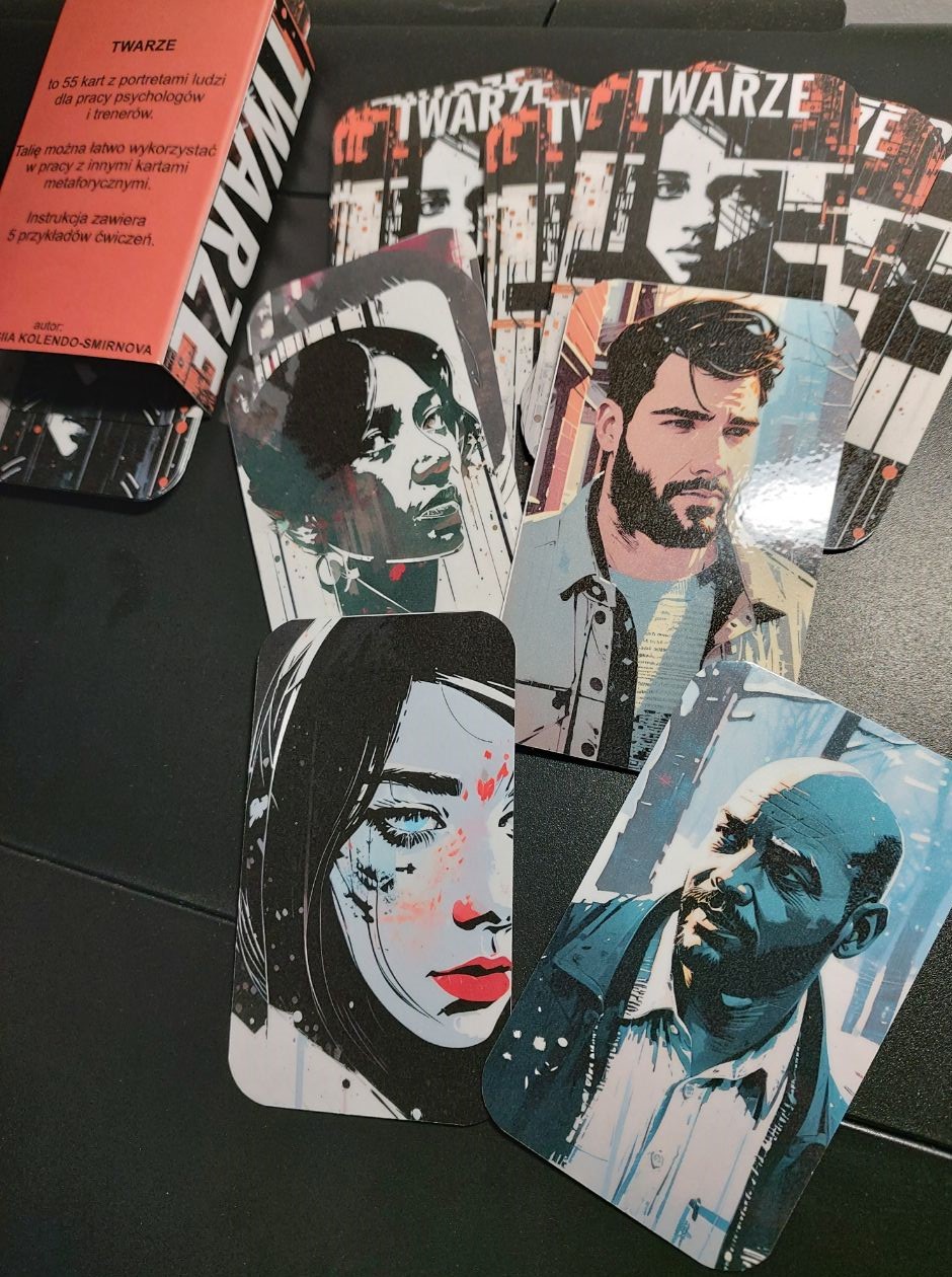 „Twarze” to zestaw 55 kart metaforycznych z wizerunkami ludzi. Każda karta przedstawia unikalne oblicze, które może stać się lustrem emocji, myśli i doświadczeń osoby pracującej z talią.